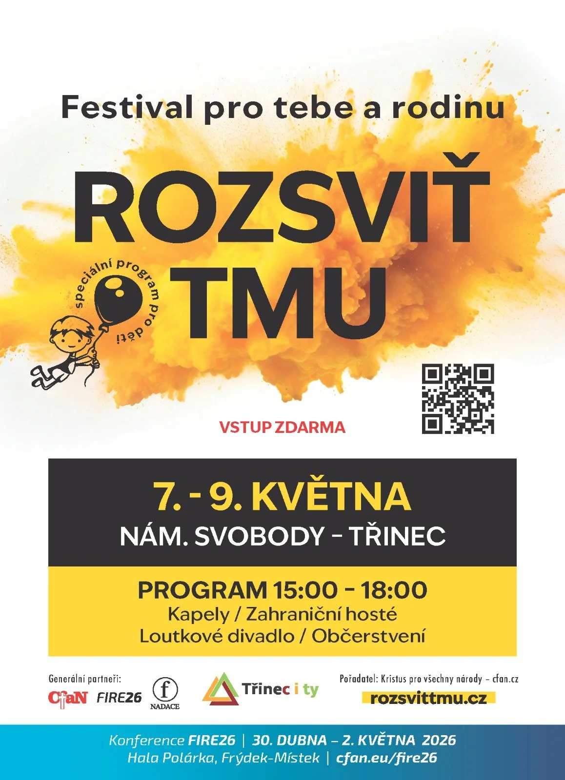 7.-9. 5. také v Třinci proběhne festival “Rozsviť tmu” určený především rodinám s dětmi, ale nejen jim. Program pořádaný mezinárodní misijní organizací CfaN a třineckými církvemi probíhá každé odpoledne na nám. Svobody.